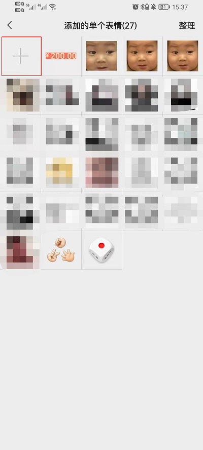 5、在表情包界面,我们可以点击【+】进入手机相册选择刚刚保存的红包图片,添加为表情包;