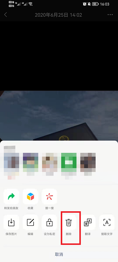 4、最后点击右上角的【.】,屏幕下方会弹出一个弹窗。然后在弹出的窗口界面中找到【删除】,点击删除即可删除朋友圈。