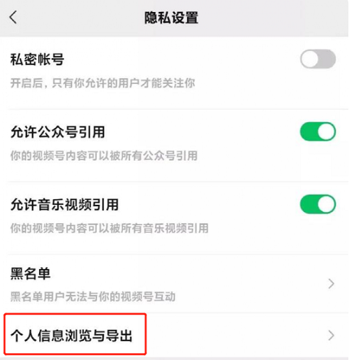 视频账号隐私设置页面新增“个人信息浏览与导出”选项。