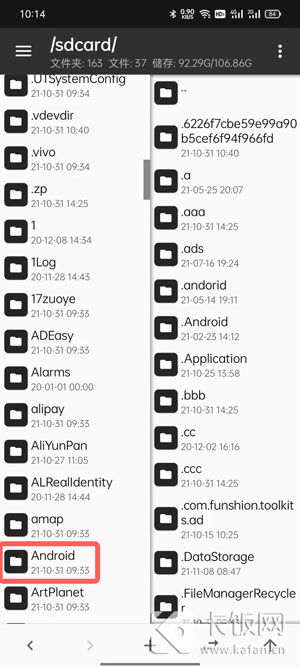 3、上下滑动找到【Android】文件夹,注意与“.Android”文件夹的区别;