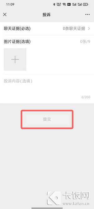 5.选择需要投诉的聊天证据,上传截图,输入投诉内容,点击【提交】。