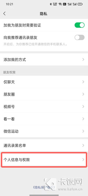 3、点击隐私设置最下方的【个人信息与权限】设置;