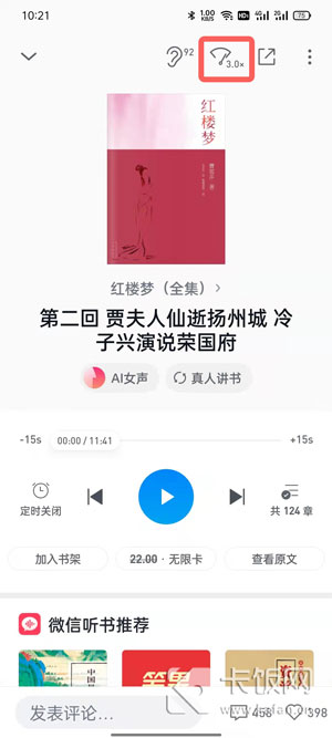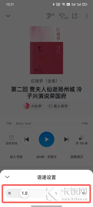 3、在收听界面,点击右上角【速度】按钮,可以调节收听速度;