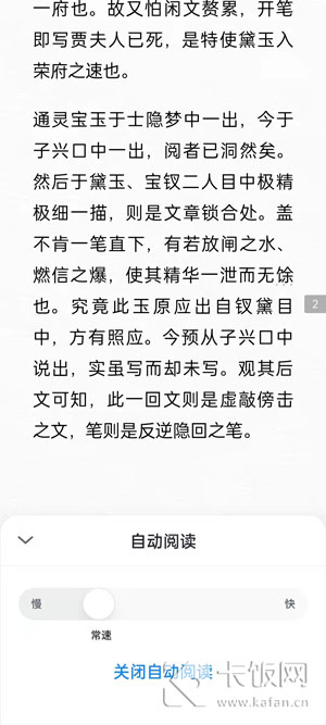 5. 拉动滑块调节自动阅读速度。如需关闭,请点击【关闭自动阅读】。