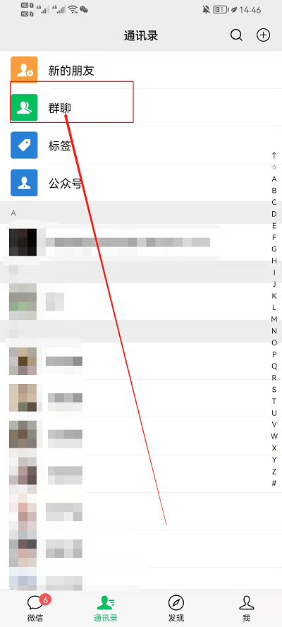 2、然后在通讯录界面,点击顶部的群聊,进入群聊界面;