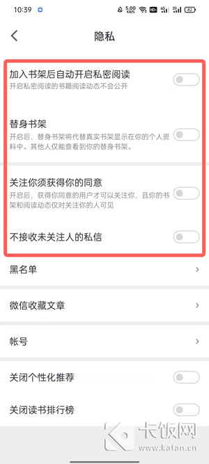 4、开启【加入书架后自动开启私密阅读】、【替代书架】、【关注你需要征得你的同意】、【不接收未关注者的私信】等功能;