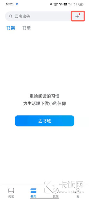 2、打开微信阅读后,点击【书架】界面右上角的【+】;