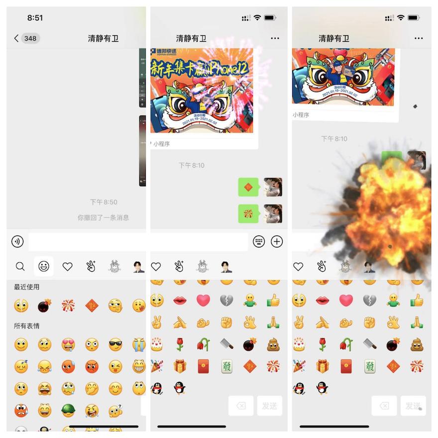 猎云网在使用过程中发现,微信8.0版本更新了自带的表情包,添加了一些新的表情。用户发送微信自带的表情包后,显示会比之前的版本更大。 1秒后,会有一个缩小到正常大小的动画。特殊表情符号将具有全屏动画,例如“庆祝”将充满烟花,“炸弹”将在屏幕上爆炸。事实上,张小龙前天就已经在微信之夜讨论过“扔炸弹”的想法了。