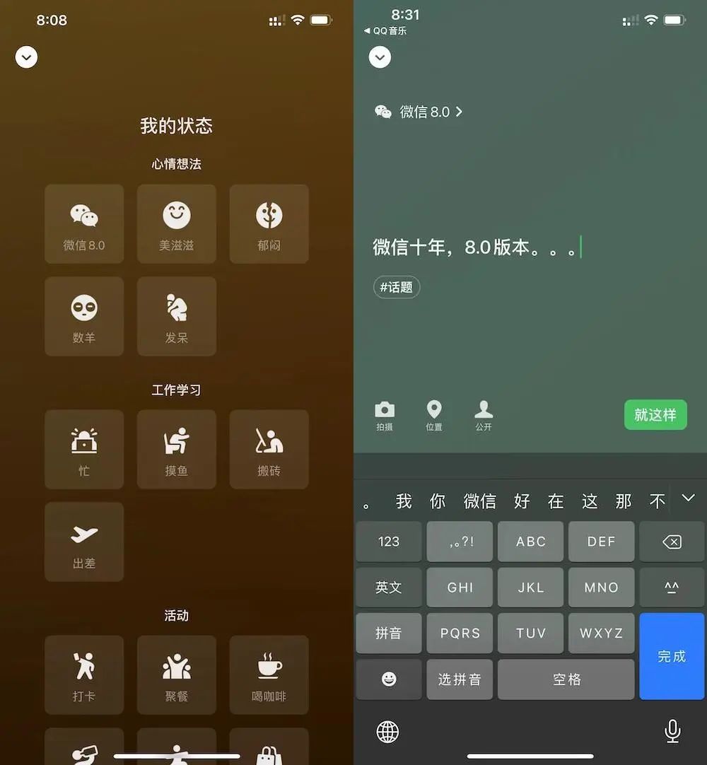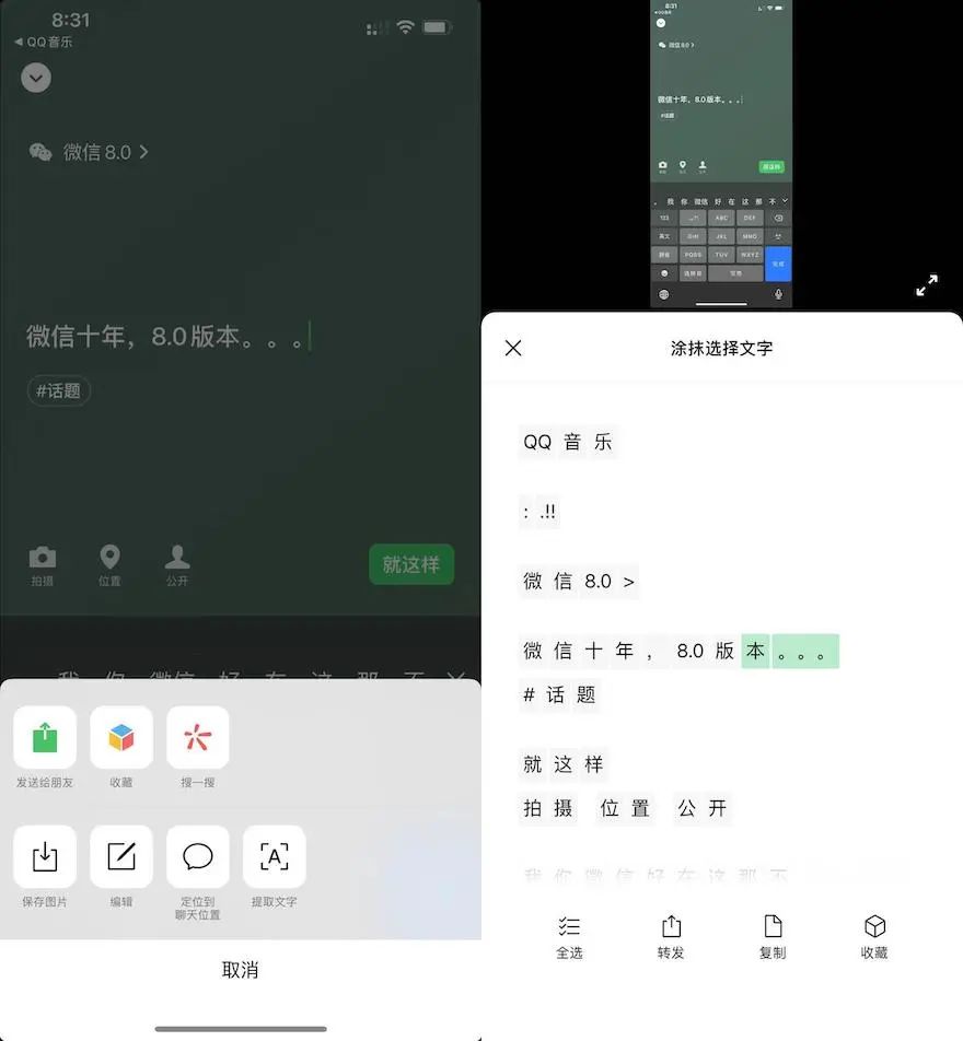 微信8.0更新内容列表特效不显示更新内容表情特效未知状态状态背景图好友状态状态变化直播收入封面视频原声提取青春模式背景图屏蔽点击上方文字查看相关内容