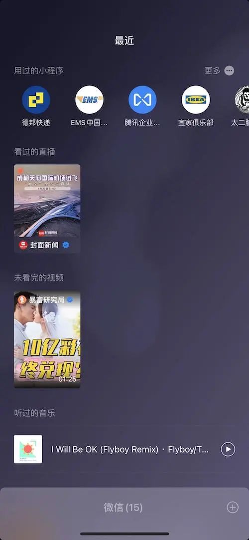 在微信首页的下拉页面上,新观看的视频账号直播、未看完的视频、听过的音乐、未看完的文章等不再是用过的小程序“唯一青睐”的。