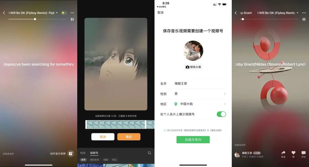 在音乐可视化方面,猎云网打开QQ音乐分享的一首歌曲,点击播放进入浮窗状态,然后点击进去截取一段音乐,配上一段用户拍摄的视频或者一些“推荐”微信视频提供的”经过处理后显示在播放界面上。在音乐播放的左下角,还会显示谁正在和你听同一首歌。带有“我