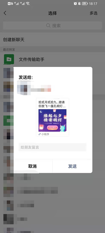 4.然后选择你想要放孔明灯的好友,然后发送给用户。