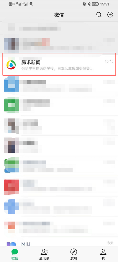1、首先打开微信,然后在聊天界面找到腾讯新闻,然后开启此功能;