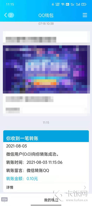 5、完成微信支付后,直接将款项转账至QQ账户(无需手动收款),对方可通过QQ钱包消息推送查看转账明细。