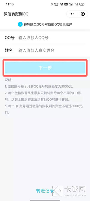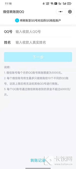 3、进入小程序后,按要求输入收款人QQ号和QQ账号实名认证名称,点击【下一步】;