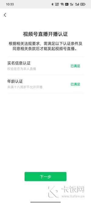 6、首次使用视频账号直播的用户还需要完成实名认证、年龄认证等,满意后点击【下一步】;