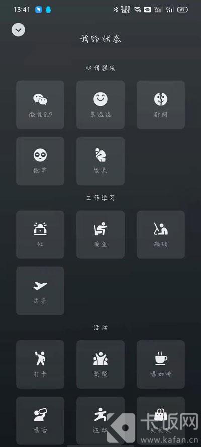 3、我们可以添加心情、想法、工作学习、活动等状态,选择我们想要添加的状态进入;