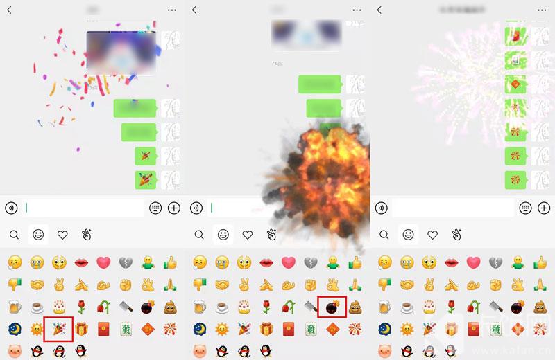 5.如果发送【庆祝】、【炸弹】、【烟花】等表情,会出现全屏动画效果。去尝试一下吧。