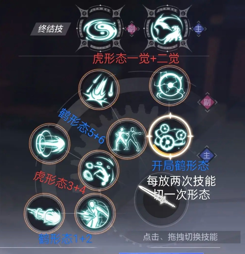 技能键的位置如下。默认是一开始的起重机形状。鹤形精神超然(对应钥匙1,同上),灵魂增加,心神寂静。 2、激光释放,虎形幻鸟3后退,加第二段触脸。四掌散掌拍在脸上,造成伤害,五击呈鹤形,踩在影子上。