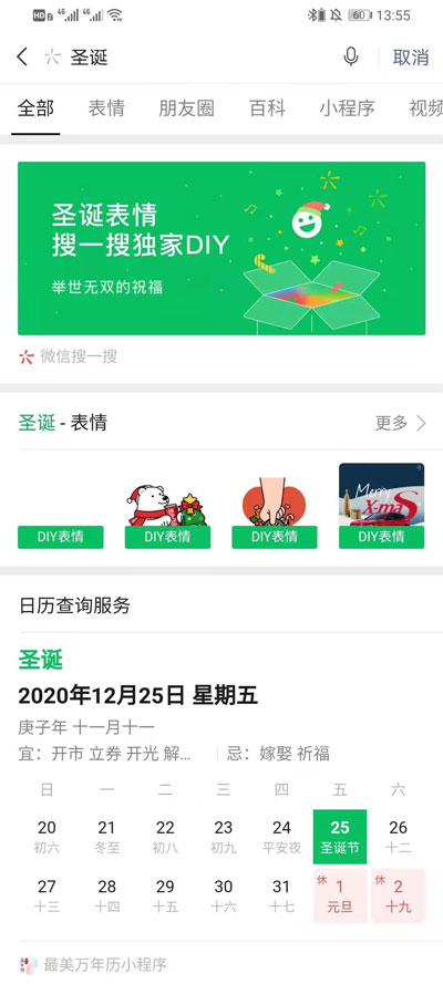 1、将微信版本升级至Android 6.3.32及以上、iOS 6.5.1及以上,在微信搜索框中搜索“圣诞快乐”四个字,点击搜索;