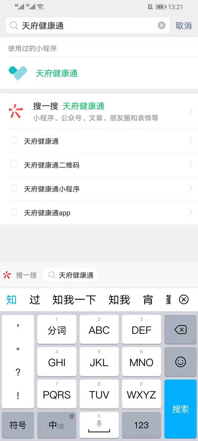 2.在搜索界面点击输入【天府健康通】。输入完成后,点击搜索;