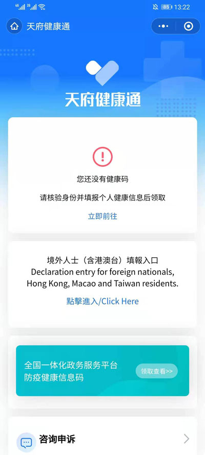 4.点击天府健康通中的【立即办理】,申请天府健康通,即可在成都地区使用该健康码。