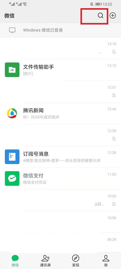 1、首先我们需要在手机上打开微信,进入手机上微信的聊天界面,点击右上角的【放大镜】进入搜索界面;