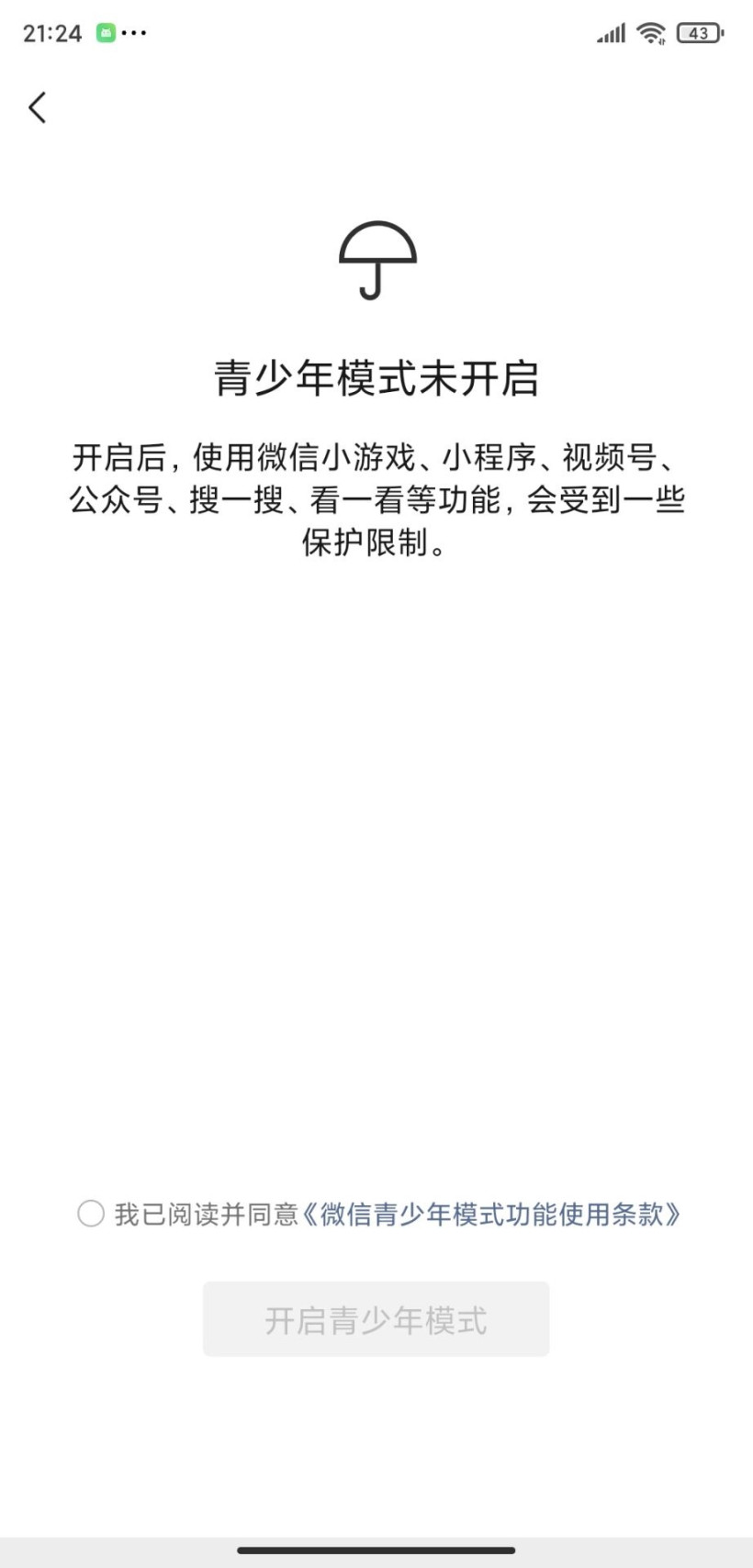 1、青春模式开启后,您在使用微信小游戏、小程序、视频号、公众号、搜索、搜索、看看等功能时,将受到一些保护限制。如需启用,您需要阅读并同意《微信青春模式功能使用条款》。