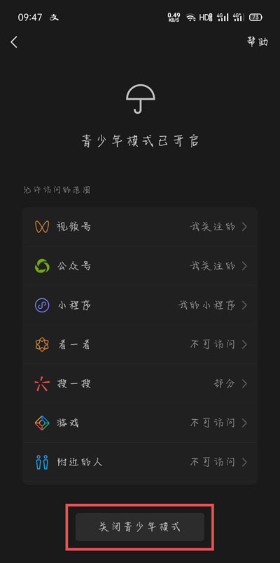 5、验证成功后,您可以进入青春模式设置页面,点击下方【关闭青春模式】;