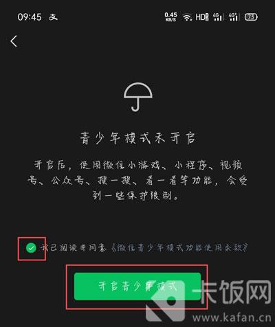 5.勾选下方【我已阅读并同意《微信青春模式功能使用条款》】,选择【开启青春模式】;