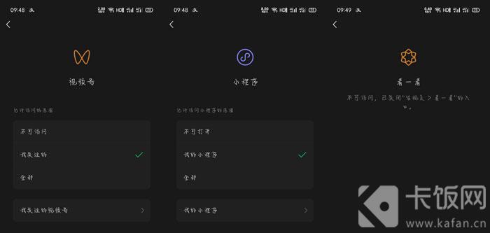 8. 例如,对于“视频帐户”,您可以选择三种权限:“不可访问”、“我关注”和“全部”。如果我们没有或者已经关闭了权限,就会显示“无法访问”;