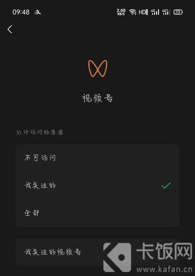 6、比如设置视频账号范围,点击进入设置,将视频账号设置为“不可访问”或者只能查看“我关注的”,或者可以访问“全部”;
