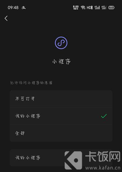 7、如果要限制可以打开的微信小游戏,选择“小程序”,将可访问范围选择为“我的小程序”。那么你就无法打开除我的小程序之外的小程序;