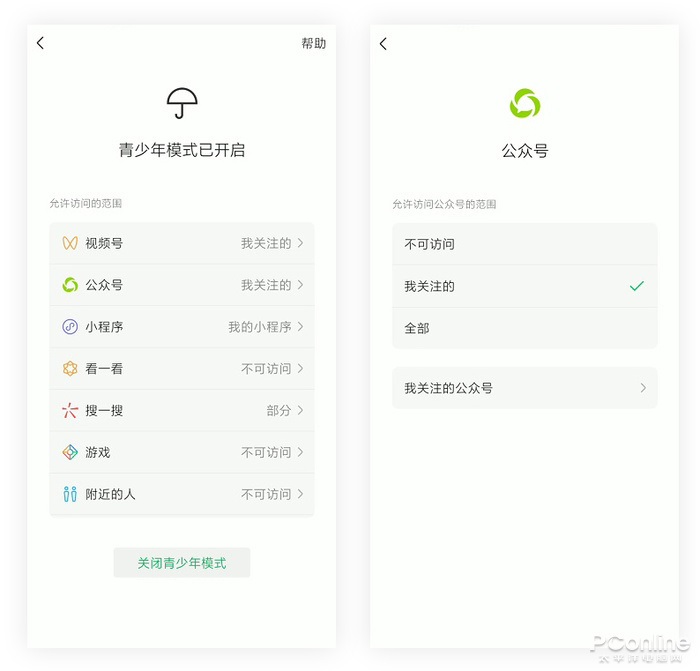 等娱乐功能,防止未成年人沉迷。不同的是,微信允许用户自定义某些模块的拦截级别。例如,在“公众号”和“视频号”中,提供