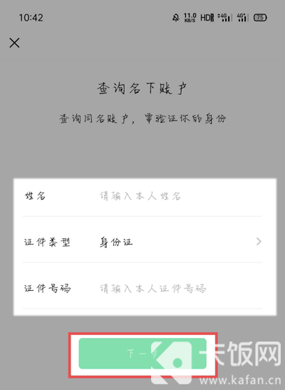 8、输入当前账户实名身份信息,点击【下一步】;