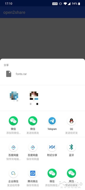 2.点击open2share按钮,你会发现Android系统中的大部分分享频道都会弹出!在界面中,您可以将文件分享到QQ、邮件等其他应用程序。