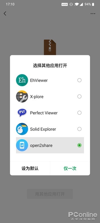 1、点击微信,选择需要分享的文件,点击该文件的“用其他应用程序打开”按钮,就会看到“open2share”选项。