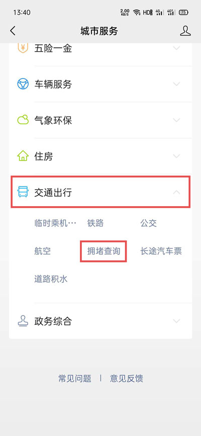 3、然后在顶部更改所在城市,向下滑动展开【交通】,选择【拥堵查询】;
