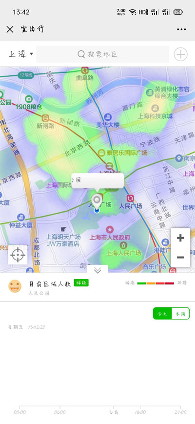 5.自动跳转到出行友好页面。上下滑动即可查看当前地图的热力图。根据下方颜色指示可以看到当前位置的人数。