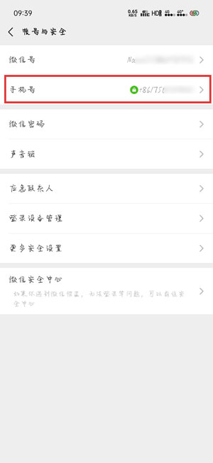 5.返回需要解绑手机号的微信账号。您可以看到帐户和安全页面。此前绑定的手机号码已解绑;