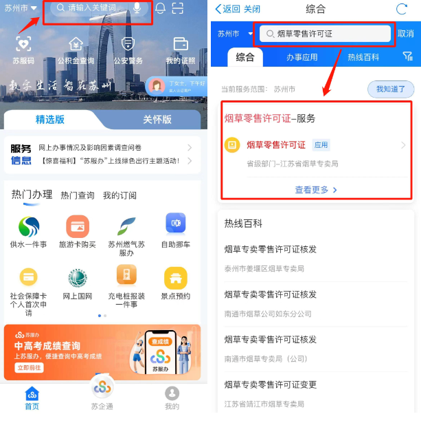 登录“苏服务办”App,在首页搜索“烟草零售许可证”,进入服务。