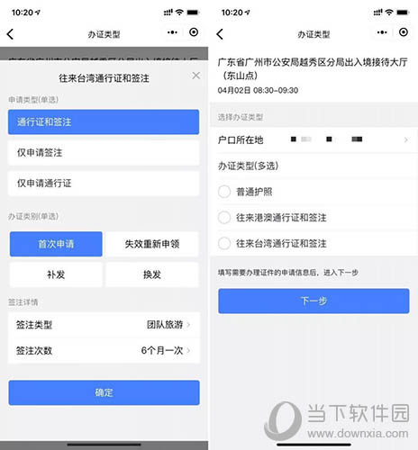 5. 确认时间后,您需要选择“报名地点”和“证件类型”。不得不说的是,出入境小程序对于证件类型的区分非常仔细,为用户预设了各种情况。