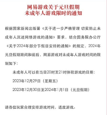 元旦三天假期期间,未成年玩家可以玩游戏。很多玩家还不知道2024年元旦还能玩多久,四天假期的晚上八点到九点都可以玩游戏。未成年人元旦游戏的详细信息。下面就和小编一起来看看时间介绍吧。