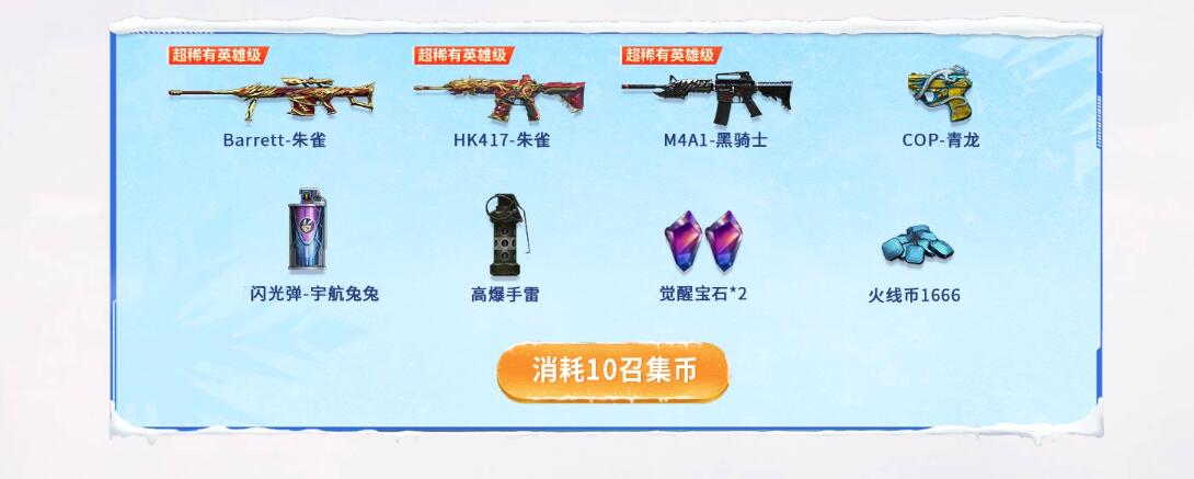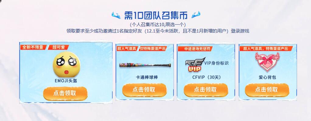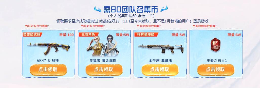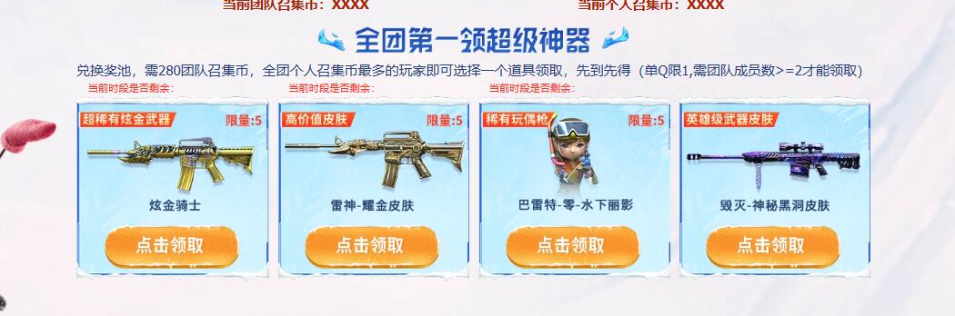 活动规则:组队好友参与游戏领取召唤币,将有机会获得众多优质武器道具。