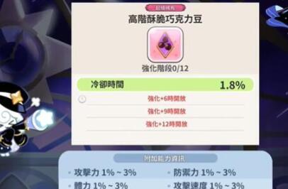 2.巧克力豆有冷却属性,也有12个强化阶段。冷却时间为1.8%。