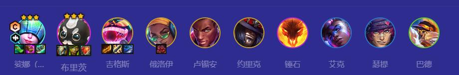 1.阵容组成:索娜、布里茨、吉格斯、俄洛伊、卢锡安、约里克、锤石、艾克、塞特、巴德