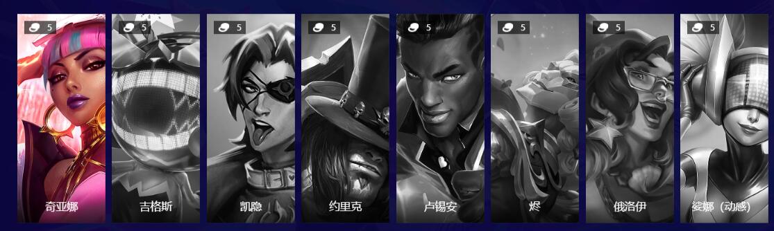 厄斐琉斯、塞拉芬娜、卡莎、凯尔、纳尔、卡特琳娜、万神殿、古拉加斯、贾克斯、塞纳、老鼠、盖伦、吟游诗人。