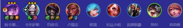 阵容构成:阿卡丽(KDA)+卡尔萨斯+约里克+卢锡安+妮可+厄运小姐+莫德凯撒+纳尔+莉莉娅