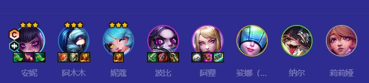 阵容构成:安妮+阿木木+妮可+波比+阿狸+索娜+纳尔+莉莉亚