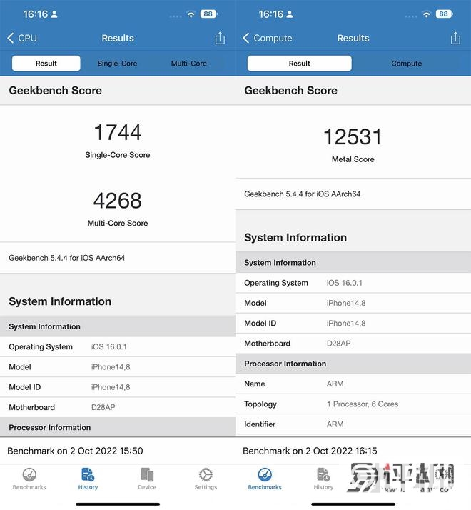 为此,我们使用GeekBench 5基准测试软件来体验iPhone 14 Plus的实际性能测试结果。从最终成绩来看,iPhone 14 Plus的单核成绩为1744,多核成绩为4268,综合算力成绩为12531。这个成绩参考iPhone 14的单核1747,多核4683,综合算力得分12659。